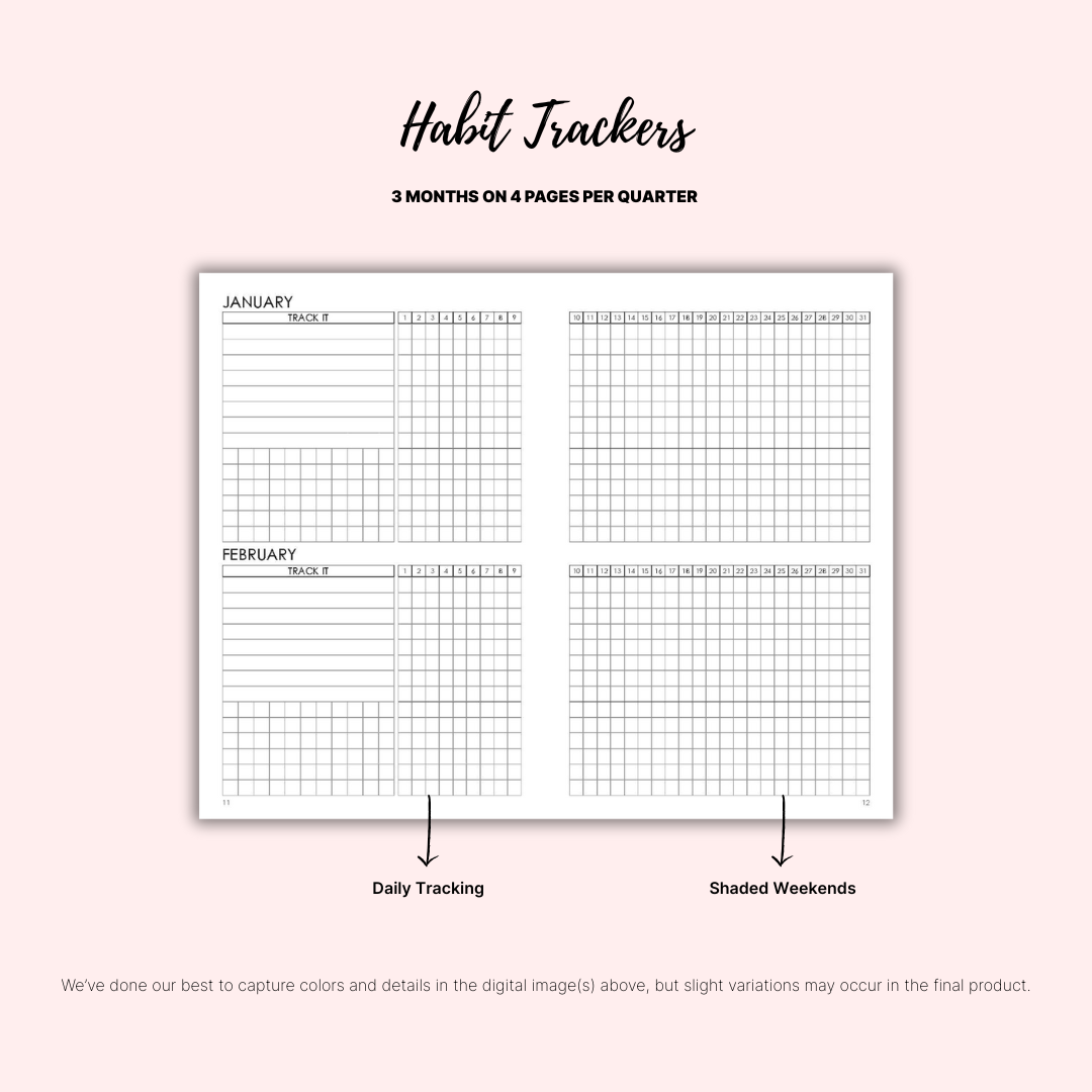 For 2026, the daily layout is available exclusively in Pocket size. The Daily combines the structure and intentional design of Plans—but with a daily focus in one compact book. It includes a month on two pages layout + daily pages, along with trackers and other functional spaces to help you plan with ease, even on the go.