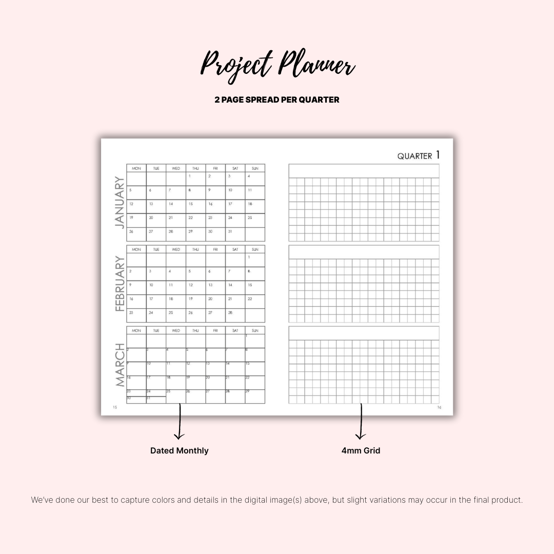 Plans - Daily is a one-book dated planner bundled by quarter, featuring monthly and daily spreads.