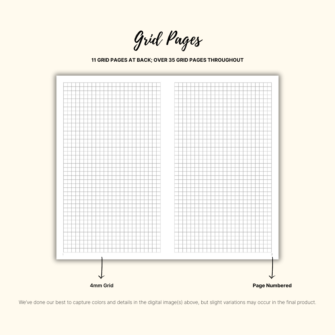 Notes & collections: 11 blank grid pages at the end of each book (over 35 total)